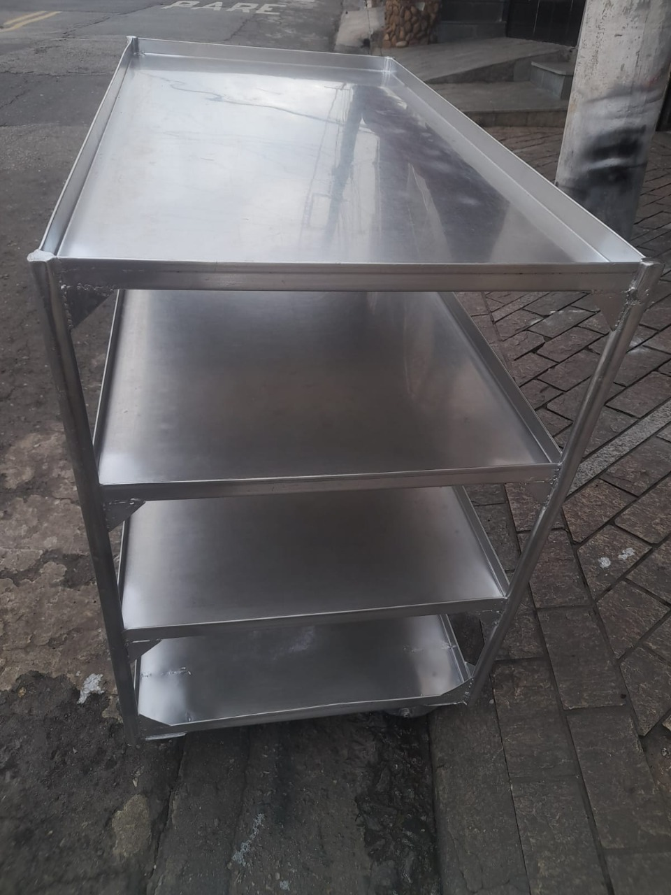 Carrinho fabricado em aço inox com 4 prateleiras. Medidas: 121 x 61,5 x 102 cm.