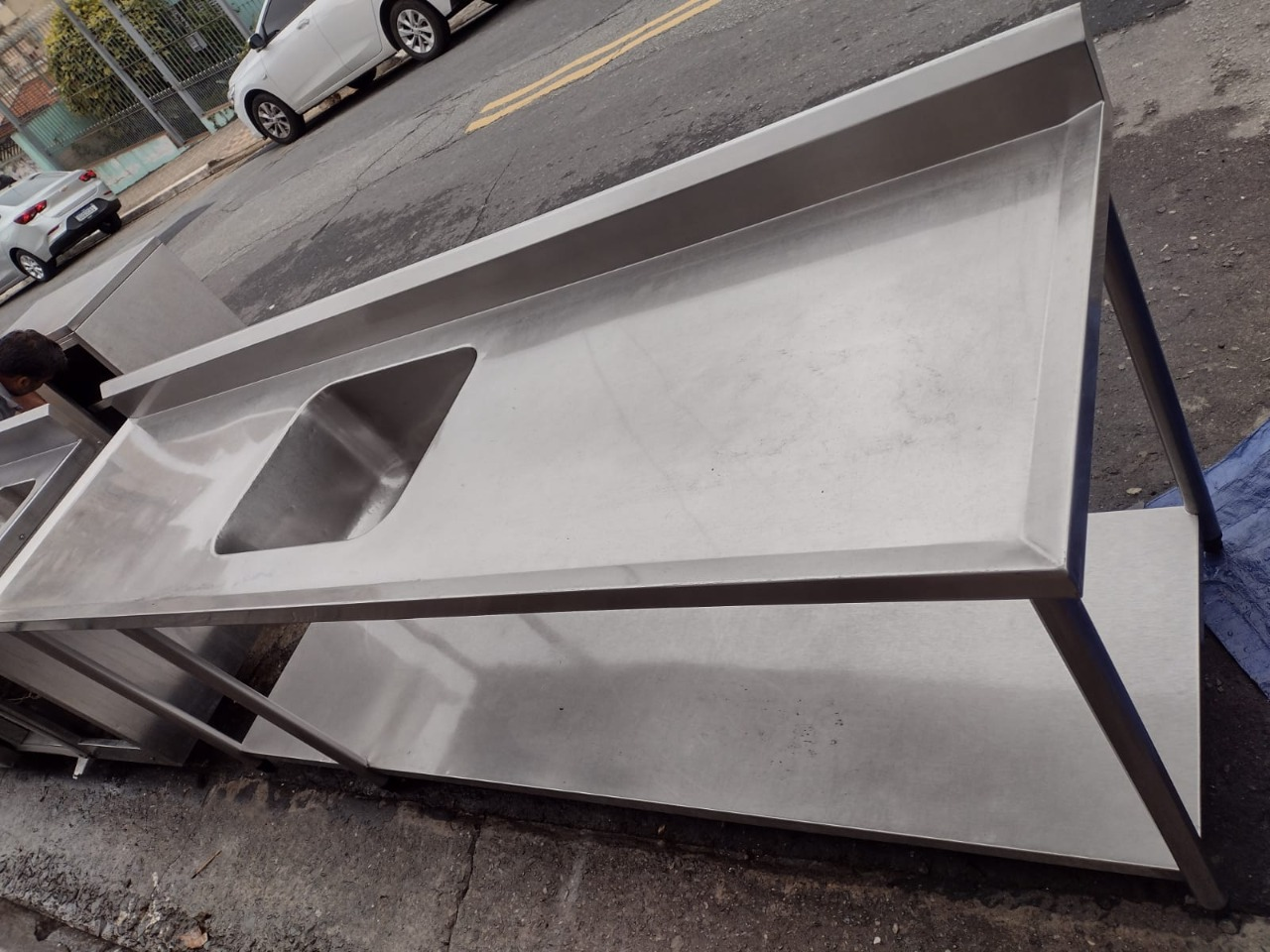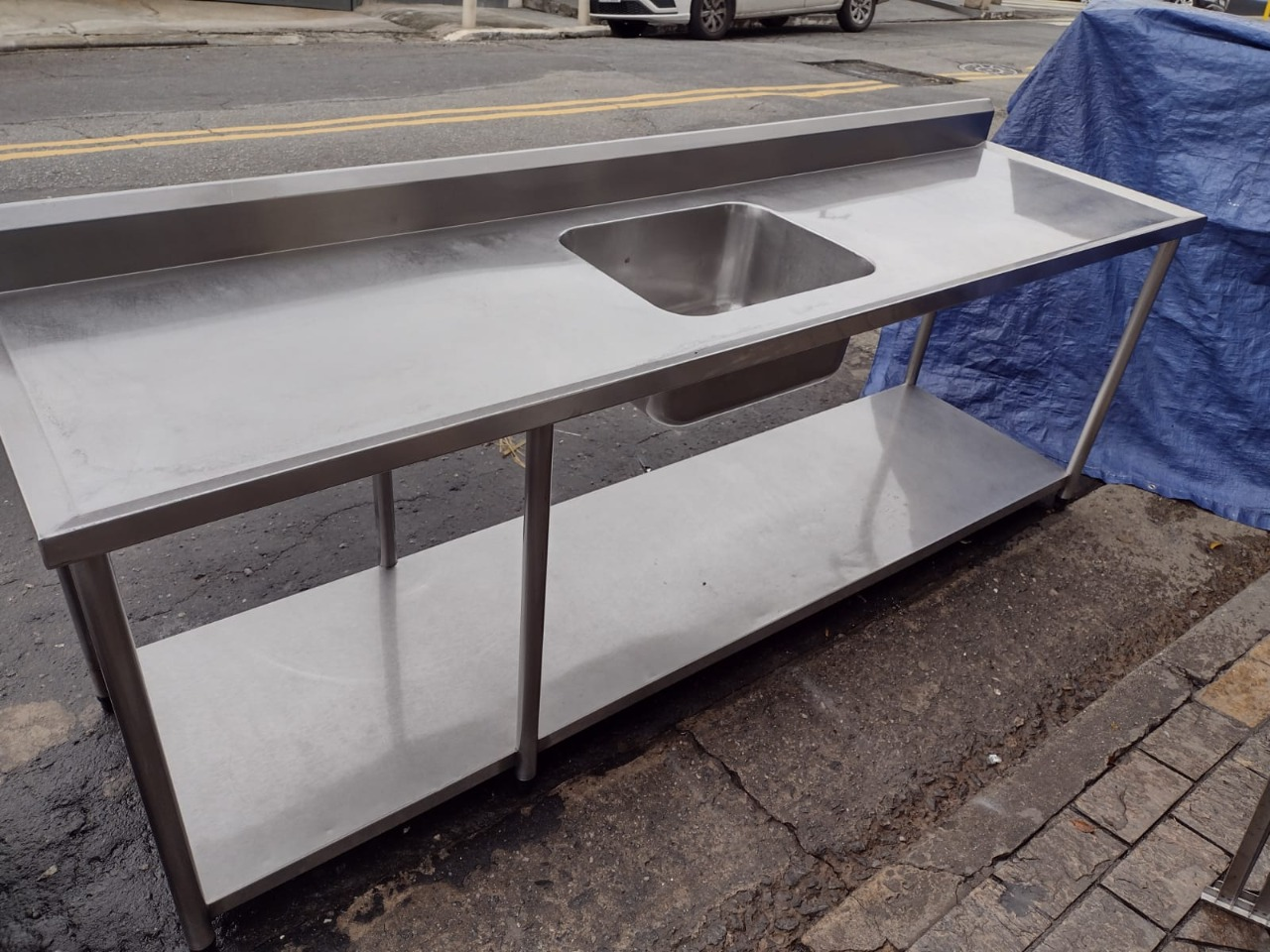 Pia fabricada em aço inox com prateleira inferior. Medidas: 235 x 70 x 85 cm.